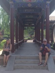 Jane and Will taking a break in the shade of a pagoda covered walkway.